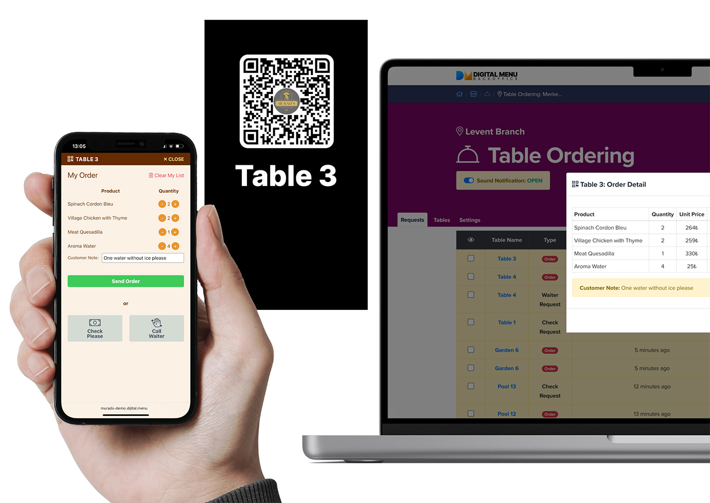 Masaya özel karekod ile müşterileriniz dijital menü üzerinden doğrudan; hesap isteyebilir, garson çağırabilir, sipariş verebilir.